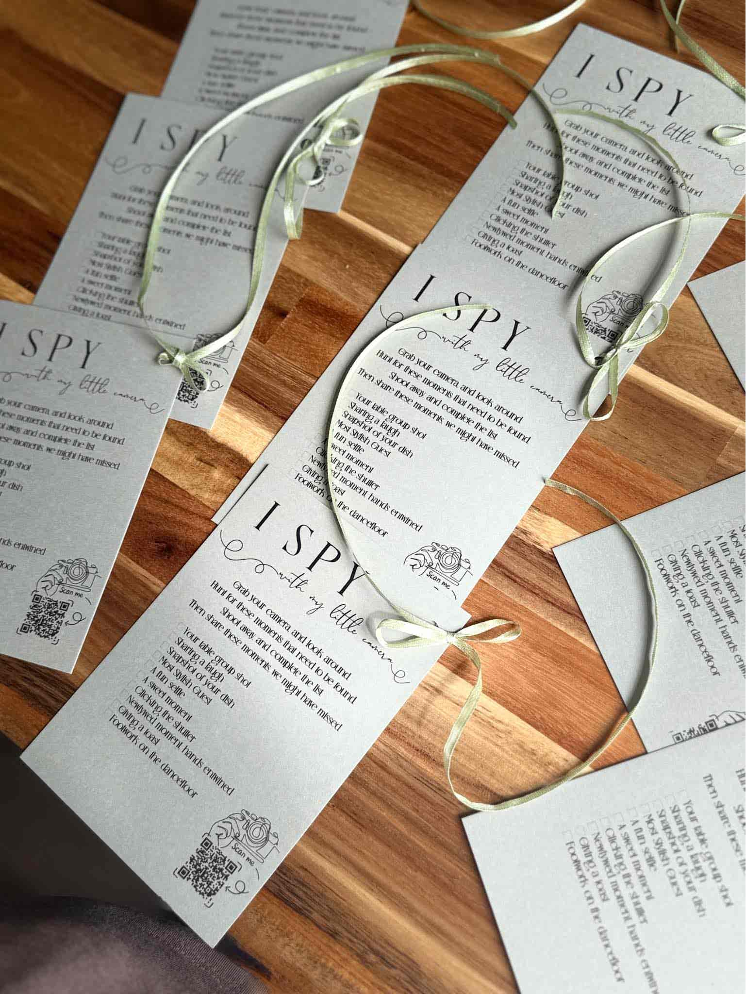 - Guest Cards: Each guest receives a beautifully designed card (printed to match your wedding stationery style) with a list of fun “I SPY” moments to look out for during the day. Examples could include candid smiles, dancing,