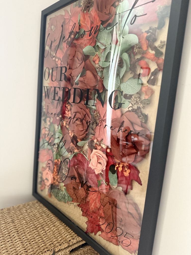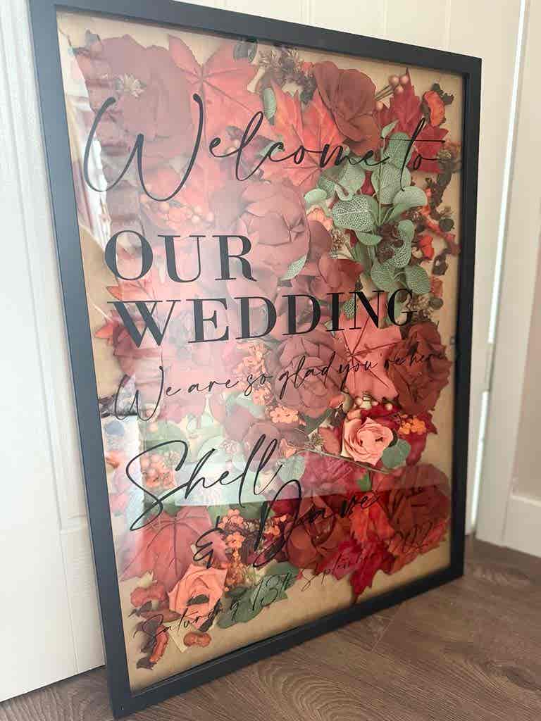 Signs can be created on foamboard, framed boards, or premium cardstock, depending on your venue and style preferences. Every welcome sign is customised to your wedding theme, with optional enhancements such as pressed or faux flowers, ribbons, or other decorative elements, creating a beautifully cohesive look with your stationery and décor.