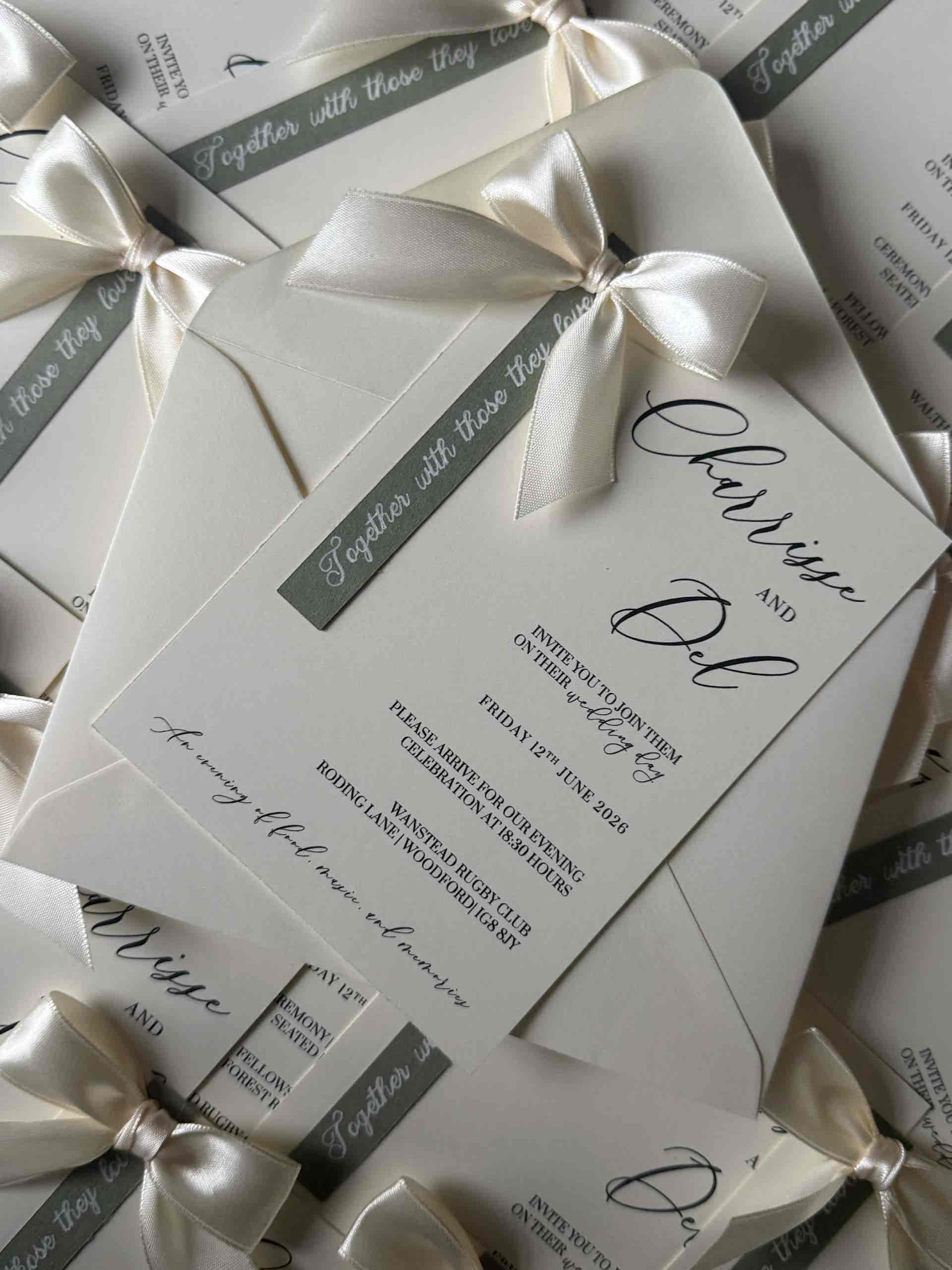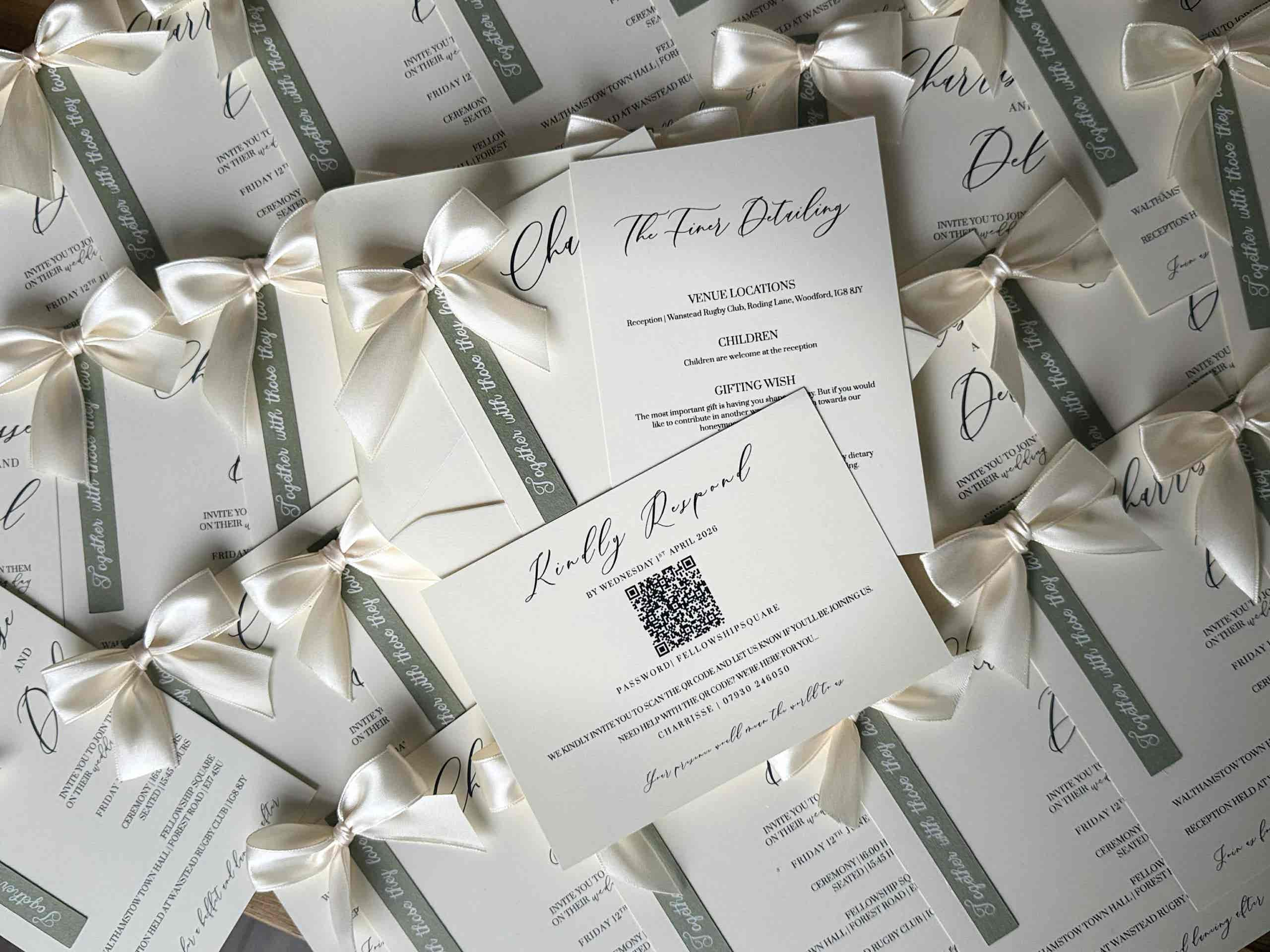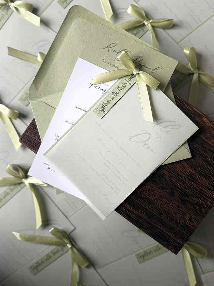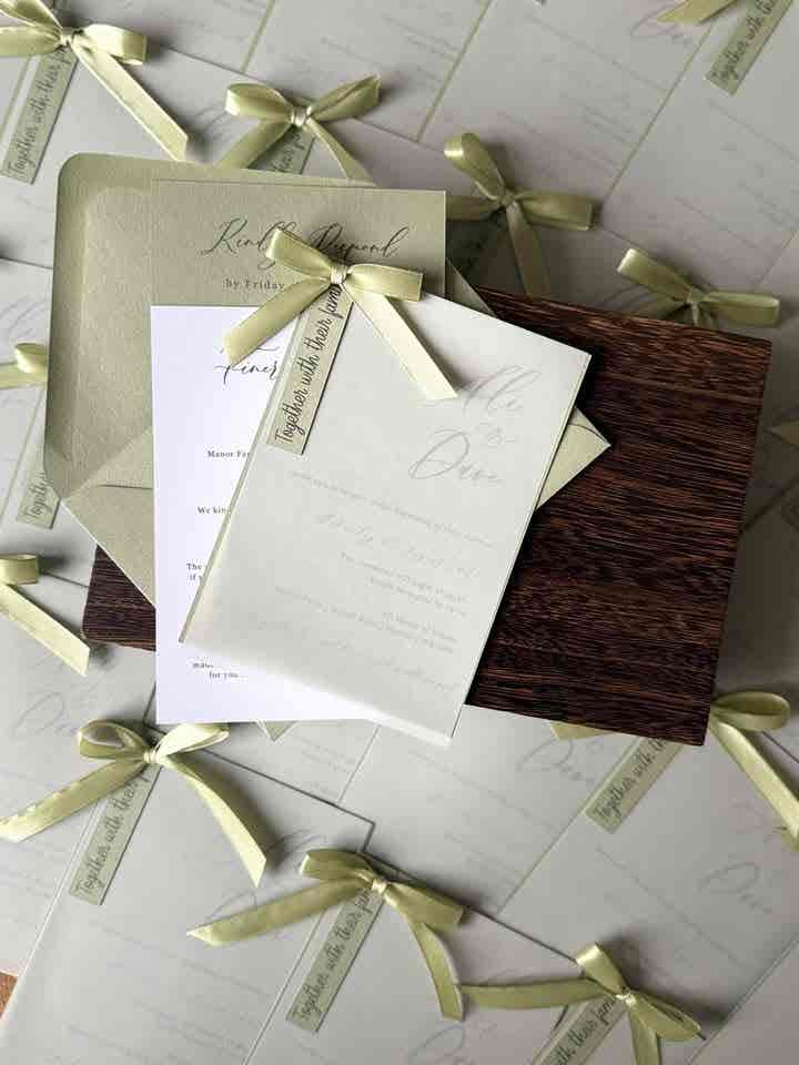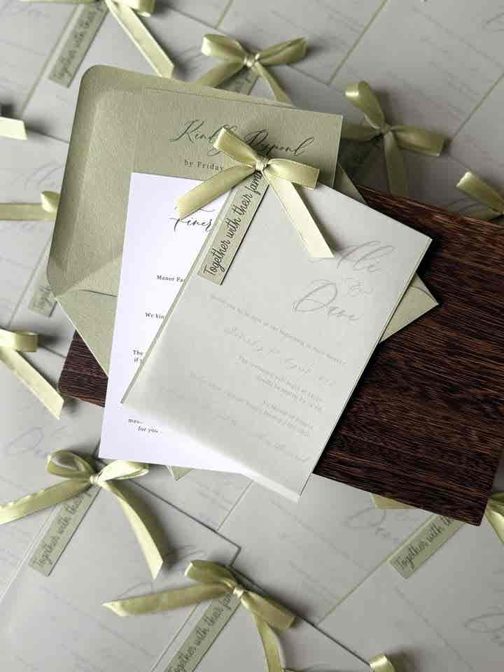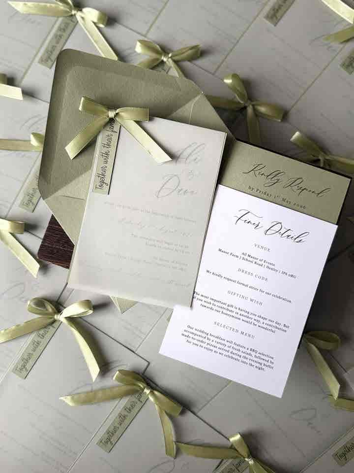 Introduce your wedding with unparalleled elegance using our Signature Collection Wedding Invite Suite from Heritage and Handcrafts. Each suite is carefully curated to provide a complete, bespoke stationary experience, featuring a main invitation, exquisite finer detailing, and your choice of optional menu card and RSVP card, all beautifully presented with a ribboned satin bow. Each suite also includes a coordinating envelope, ready for your guests.